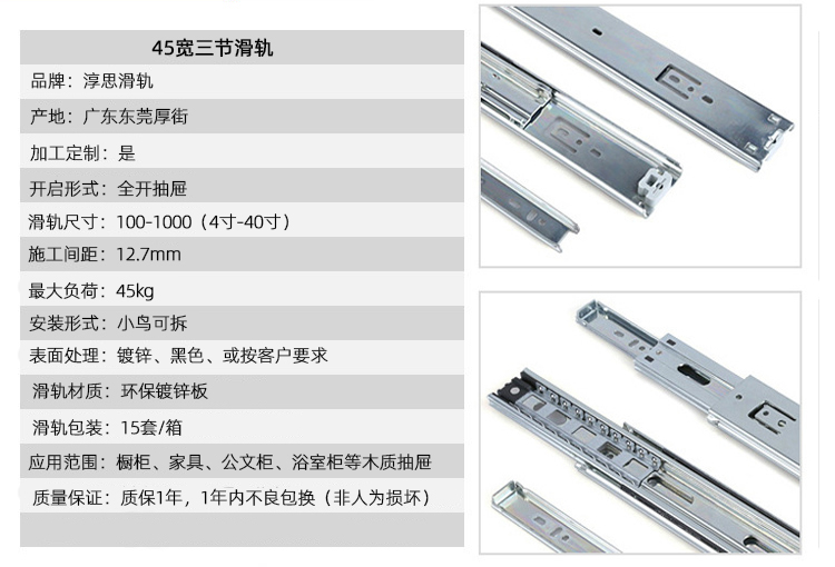 抽屉轨道是家具五金件中的重要组成部分,是各类家具中用于抽屉安装定位导向的关键部件之一。作为现代家具的重要组成部分,办公桌、书桌、厨具中均安装有抽屉轨道,如淳思滑轨来说,材质均采用冷轧钢,具有省力、推拉平顺、耐磨性好、噪音低以及承载能力高等特点,表面层静电电镀/电泳,光泽均匀,承受力强,坚固、耐用,噪音小,安装简易、快捷。